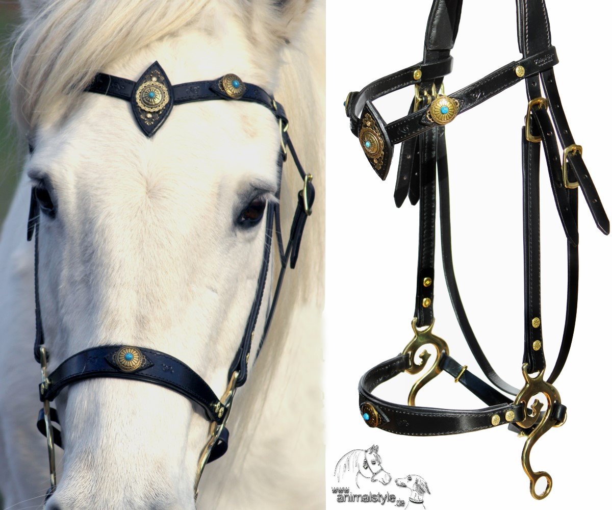 Die Verzierung mit messingfarbenen Conchos, die einen türkisfarbenen Stein in der Mitte fassen, verleiht dem Hackamore eine stilvolle und raffinierte Optik. Das hochwertige schwarze Blankleder ist ebenfalls weich unterpolstert, sodass es angenehm am Pferdekopf liegt.