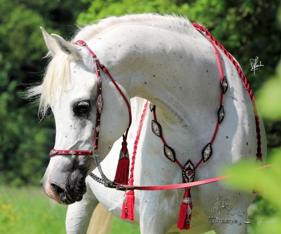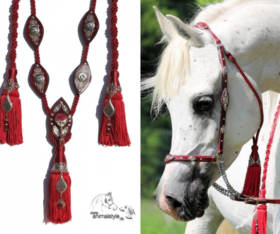 Ein außergewöhnliches Set aus handgefertigtem rotem Leder, das durch seine harmonische Farbgestaltung und herausragende Qualität besticht. Das weich gepolsterte Halfter, geschmückt mit silberfarbenen Ornamenten und funkelnden Kristallen, vereint Komfort und Eleganz. Der abnehmbare Kehlriemen, verziert mit Strass-Nieten und einem edlen Rubin-Anhänger, setzt zusätzliche glanzvolle Akzente.