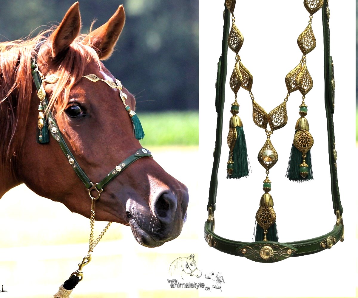 Mit weichem Nappaleder unterlegt, schmiegt es sich sanft an den Kopf Deines arabischen Pferdes und sorgt für höchsten Tragekomfort. Die edlen, bronzefarbenen Metallbeschläge, funkelnden Strass-Nieten und altmessingfarbenen Akzente verleihen ihm eine unvergleichliche Ausdrucksstärke und machen es zum strahlenden Highlight jeder Show.