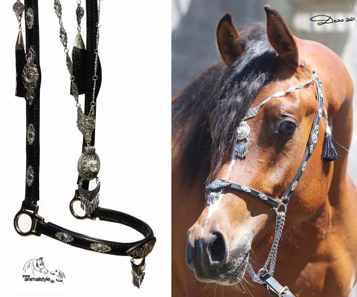 The silver-colored metal fittings, sparkling rhinestone details and artfully integrated metal rivets give the halter an exclusive as well as unique aesthetic. On each side, removeable tassel pendants create an elegant eye-catcher, which can be flexibly exchanged using the carabiner.